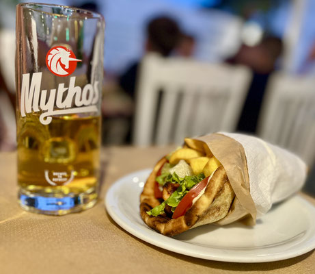 Altrimenti se vogliamo scendere di gradazione si può optare per una fresca e leggera birra Mythos per accompagnare una tradizionale Pita Gyros (panino con kebab e patatine fritte) o una Pita Souvlaki (nella versione con gli spiedini di pollo).
